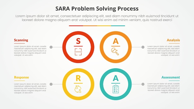 SARA modell problemlösning infographic koncept för bildpresentation med stor cirkelkontur fyrkantsstruktur med 4 punkts lista med platt stil