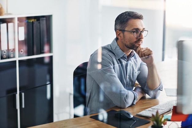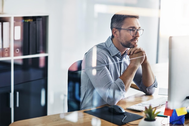 Affärsman tänker och planerar på datorn för informationsteknik eller programmeringslösning Programmerare eller onlineutvecklare läser på skrivbordet för problemlösning, beslut eller reflektion på webben