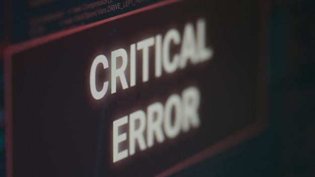 Dator som visar kritiskt felmeddelande som blinkar på skärmen efter cyberbrottsattack och hackningsvarning. Bildskärm som visar datorfel och felhot, systemkrasch. Närbild.