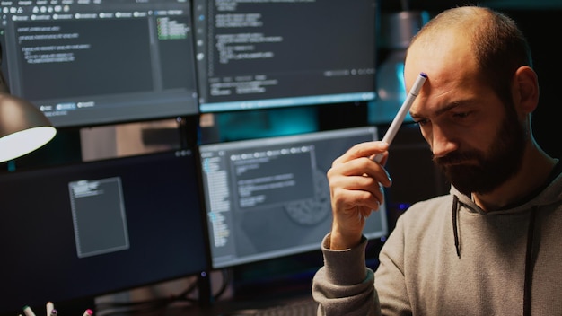 Databasadministratör funderar på programmeringslösning, brainstormar nya idéer för att hitta källkod och utveckla app. Är eftertänksam och tankfull när han arbetar med molnbaserad AI-data. Handhållen bild.