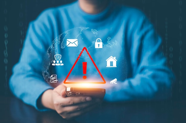 Man som använder smartphone med triangelvarningstecken för meddelandefel Programmerare som använder bärbar dator med triangelvarningstecken hackerattacker och hackning av data cyberbrottslighet cybersäkerhet