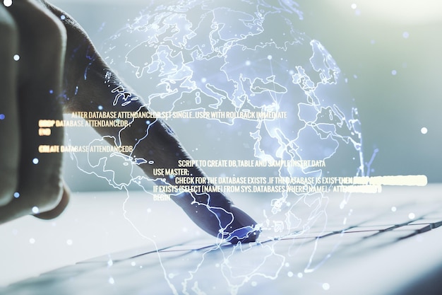 Multiexponering av abstrakt kreativ kodningsskiss med världskarta och händer som skriver på datortangentbord på bakgrund, artificiell intelligens- och neurala nätverkskoncept.