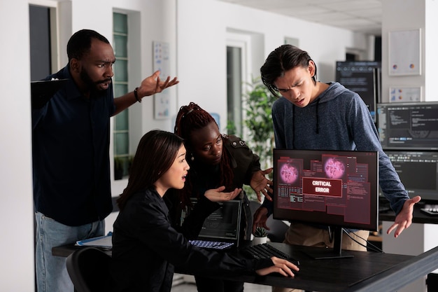 Team av mjukvaruutvecklare som har webbservern hackad, läser kritiskt fel på datorskärmen i byrån. Multietniska programmerare som försöker lösa hackningsproblem, brandväggssäkerhet.