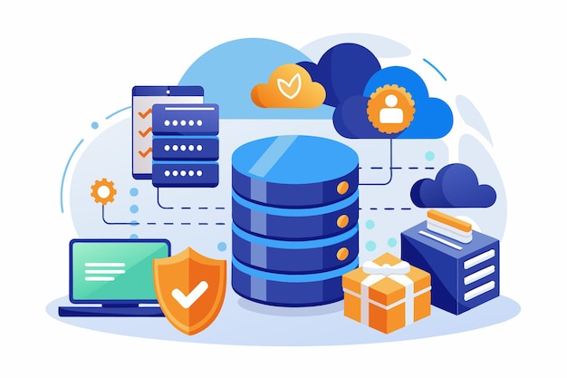 En illustration av en säker molndatabas med flera anslutningar för dataöverföring, användarautentisering och säker åtkomst