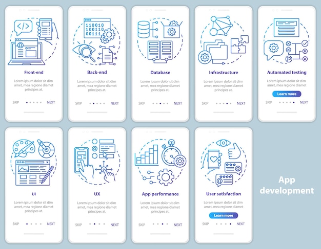 Applikationsutveckling onboarding mobilapp sida skärm vektormall. Programvaruprogrammering. Genomgång webbplats steg med linjära illustrationer. UX, UI, GUI smartphone gränssnitt koncept