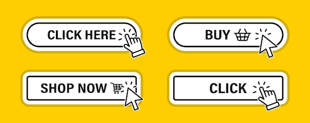 Klicka här-knapp med klickmarkör Köp nu-knapp med varukorg Shoppa nu Modern samling för webbplats Online shopping Klicka här-knappar handpekare klickar Web designelement