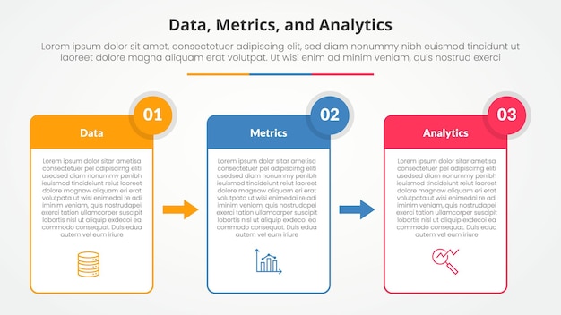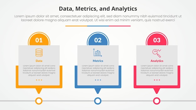 Datamått och analysinfografik koncept för presentationsbilder med box tidslinje tabell med cirkel rubrik med 3-punktslista i platt stil