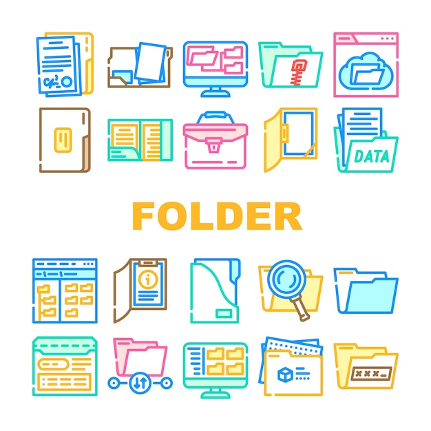 Mapp dokument företag fil ikoner set vektor kontor dator papper data arkiv information lagring portfölj öppen webb mapp dokument företag fil svarta kontur illustrationer