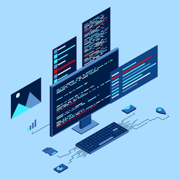 Isometrisk vy av ung programmerare som kodar ett nytt projekt med hjälp av dator.Isometrisk vy av ung programmerare som kodar ett nytt projekt med hjälp av dator.