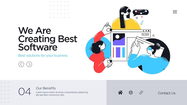 Vektormall för målsida för programvaruteknik. Webbplatsgränssnittsidé för programmering och kodning med platta illustrationer. Layout för webbplats för programmeringskurser. Webbanner, tecknad koncept för webbsida