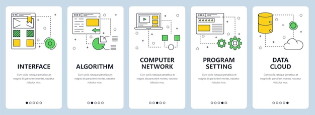 Vektorset med vertikala banners med Interface Algorithm Datornätverk Programinställning Datamoln webbplatsmallar Modern tunn linje platt stil design
